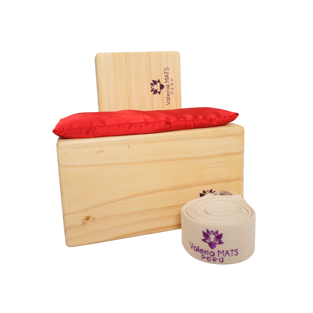 KIT BÁSICO YOGA: 2 bloques de madera + 1 correa + 1 tapa ojo